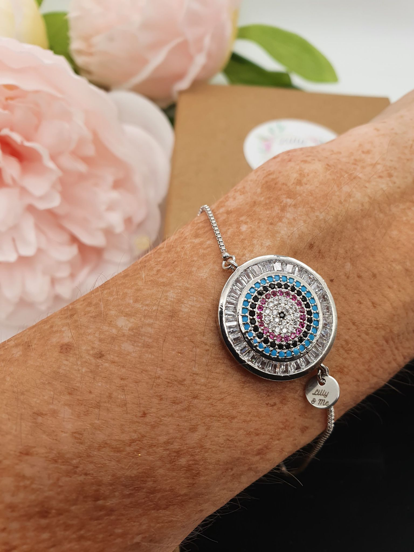 This delicate Greek Evil Eye Bracelet in Gold or Silver, with crystal inserts is a beautiful yet powerfully protective piece of jewelry for any wrist. The eye measures approx 2.3cm across.
