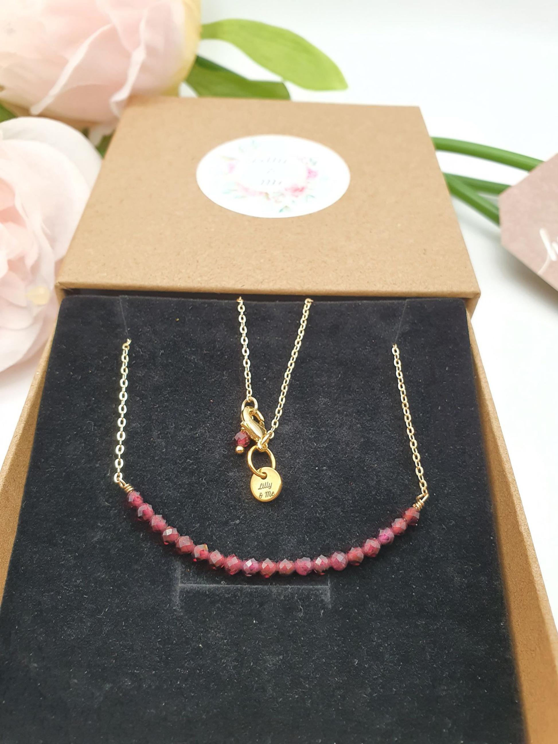 This delicate birthstone necklace is 14kt filled gold. It's dainty and beautiful, this one is a very lovely Garnet and Gold for a January birthday.
