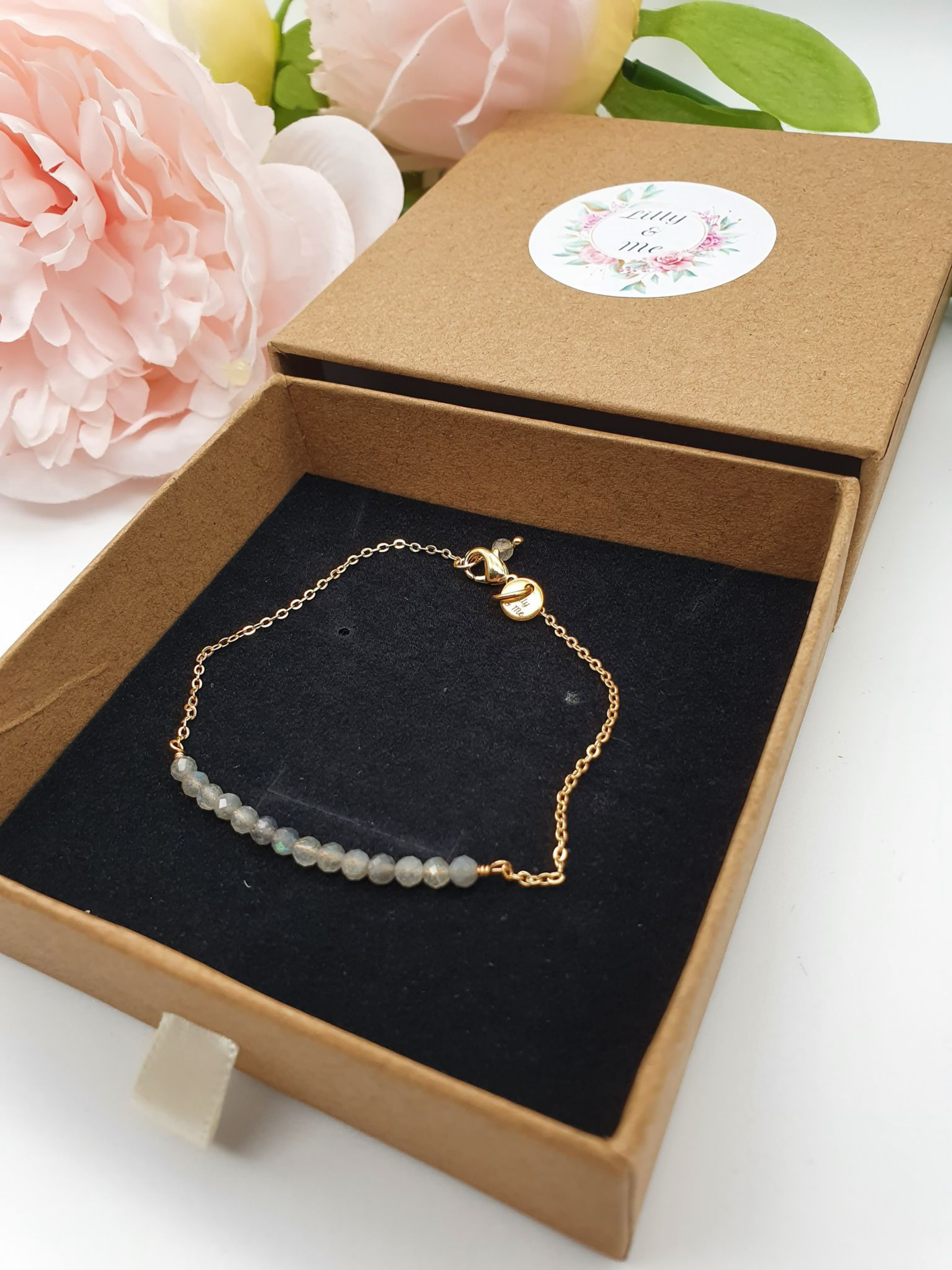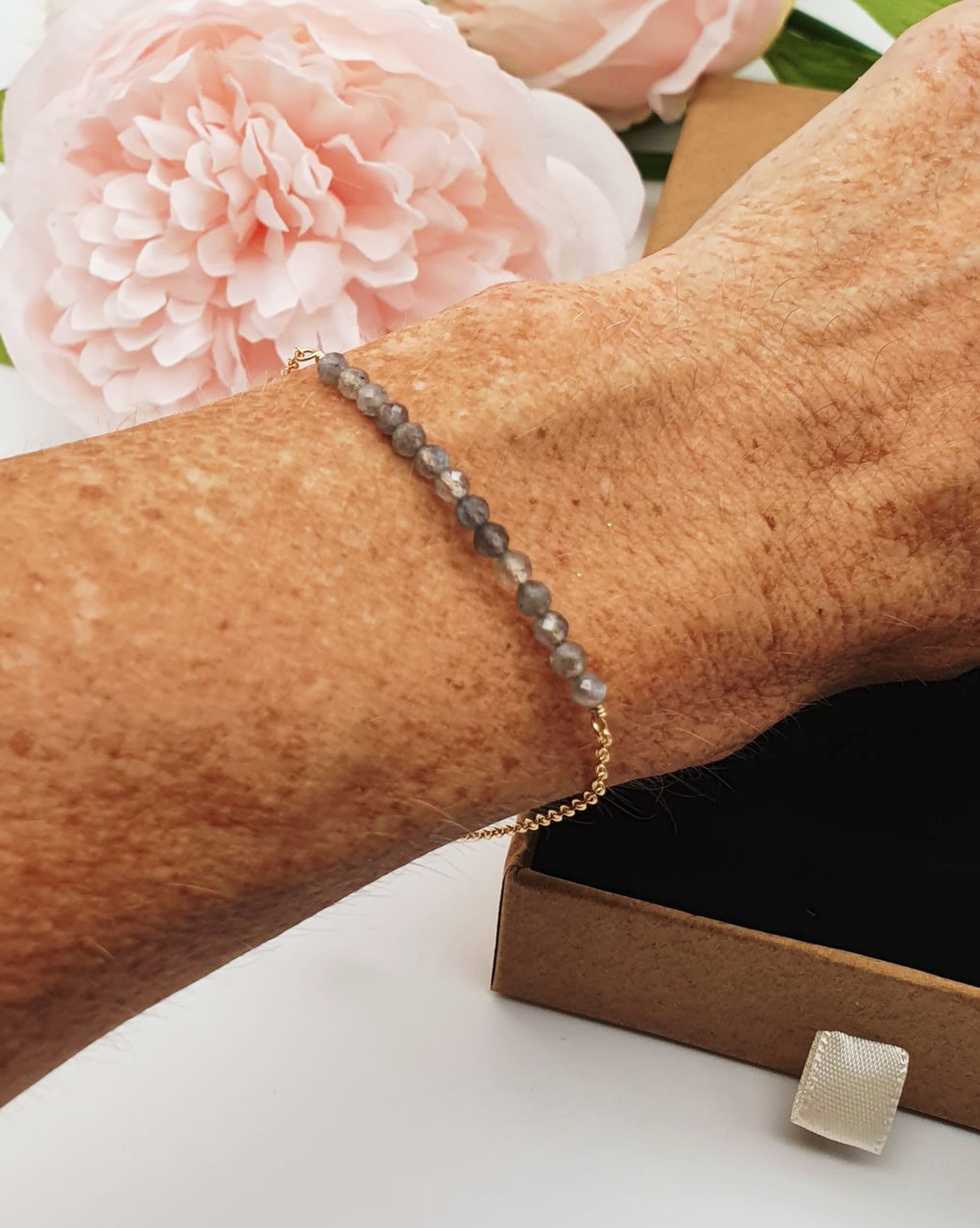 This delicate bracelet is 14kt filled gold. It's dainty and beautiful, this one is a very lovely Labradorite and Gold.