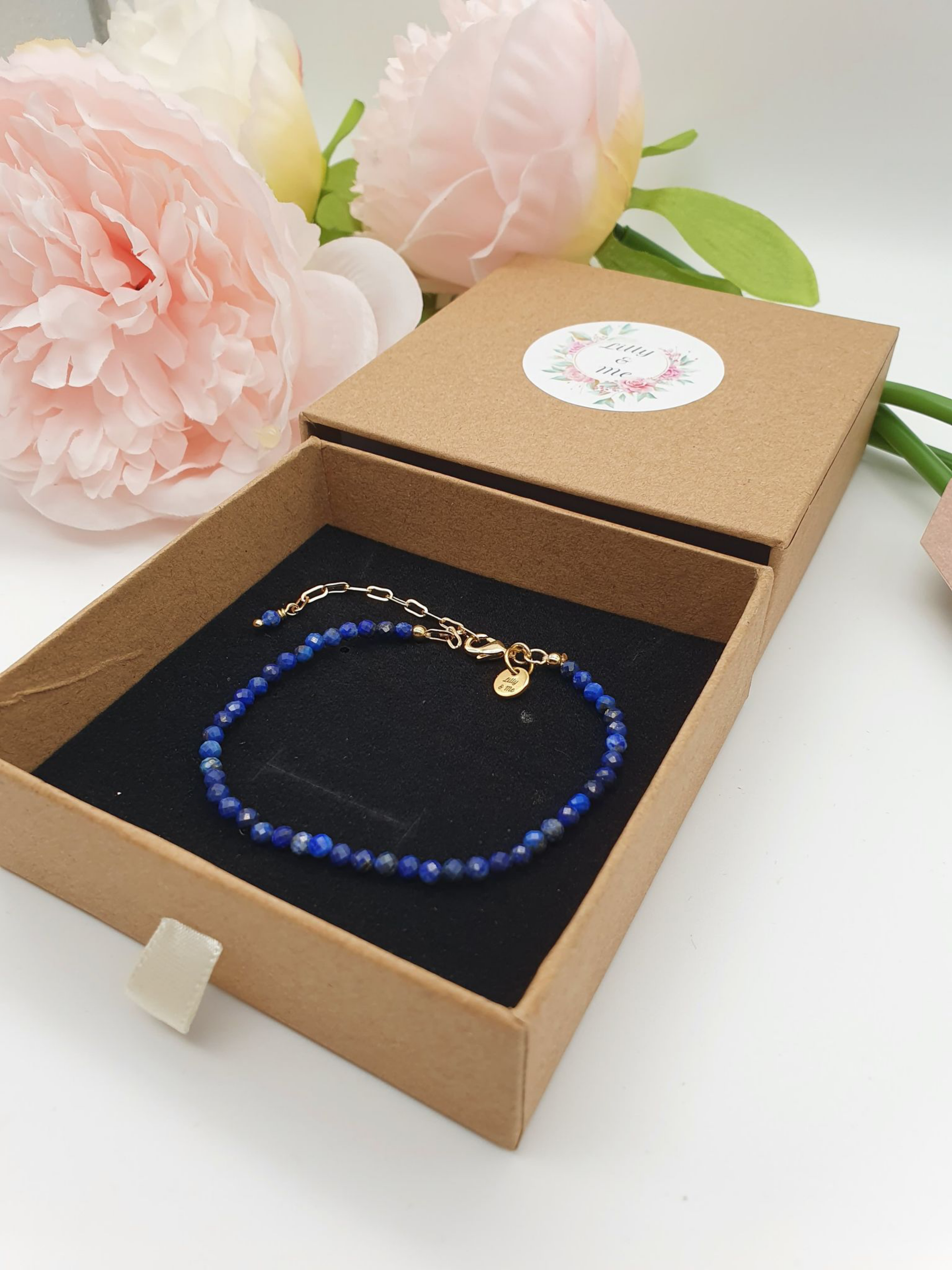 This delicate bracelet is 14kt filled gold. It's dainty and beautiful, this one is a very lovely Lapis Lazuli and Gold for a September Birthday.