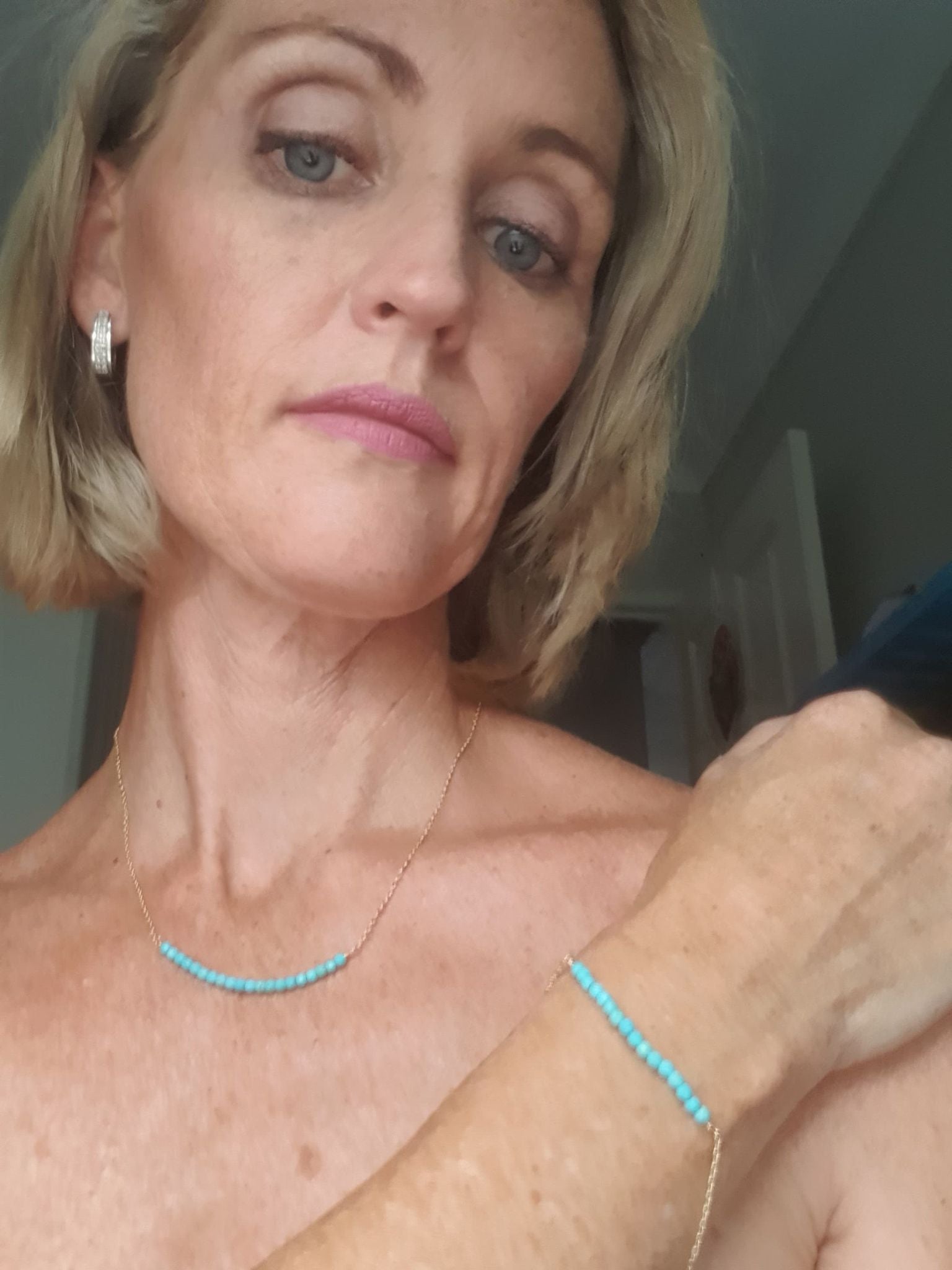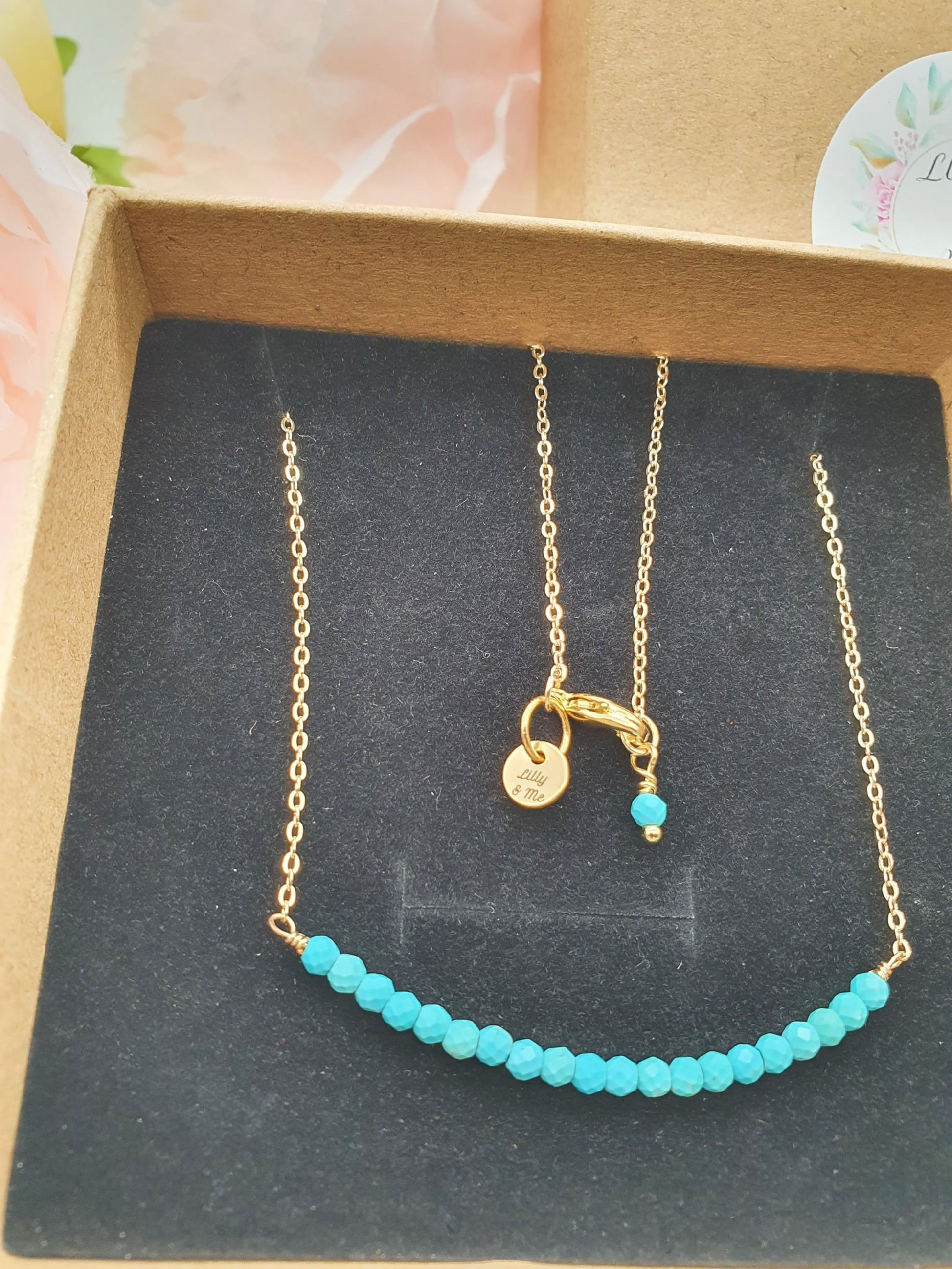 This delicate birthstone necklace is 14kt filled gold. It's dainty and beautiful, this one is a very lovely Turquoise and Gold for a December birthday.