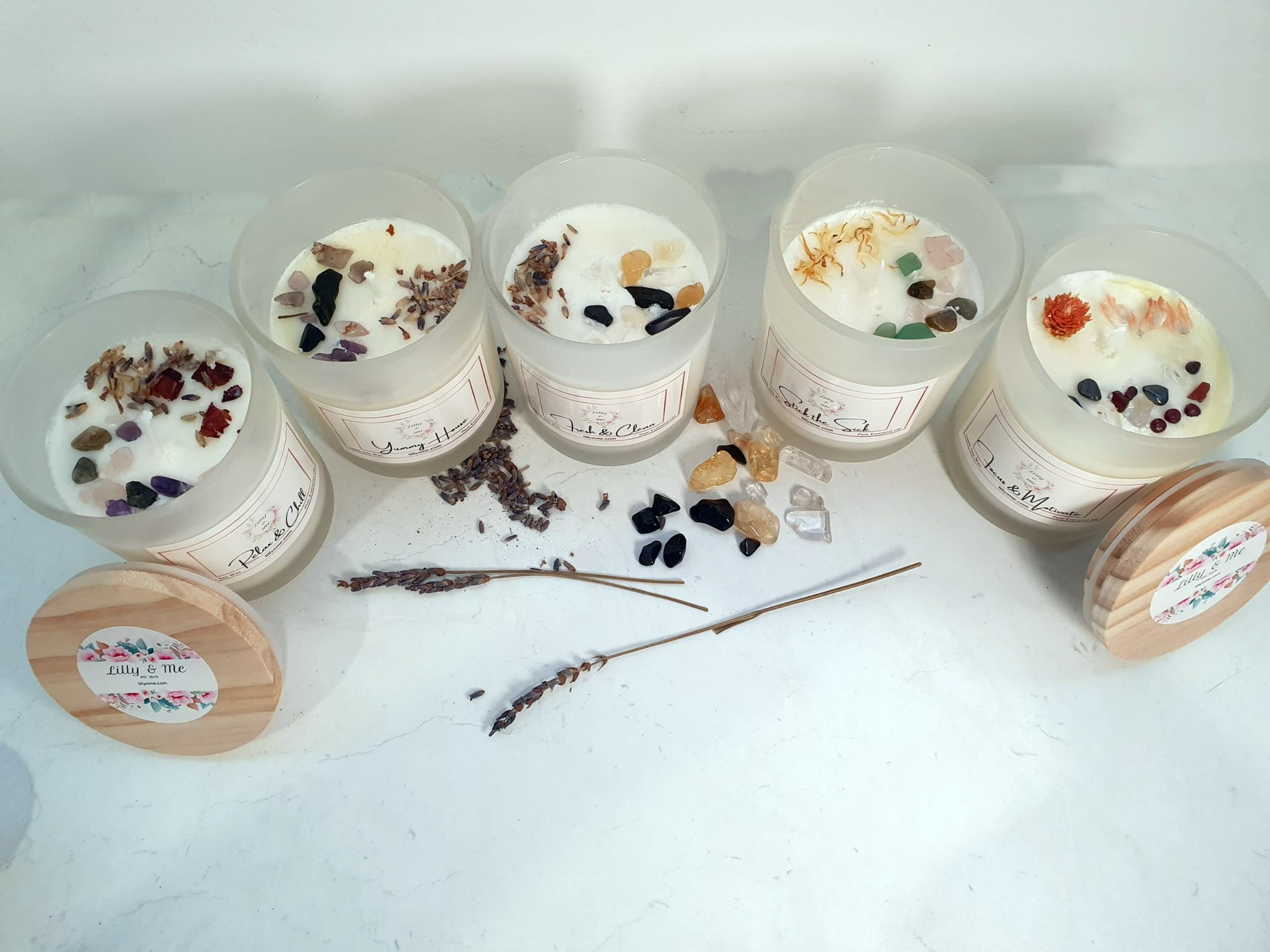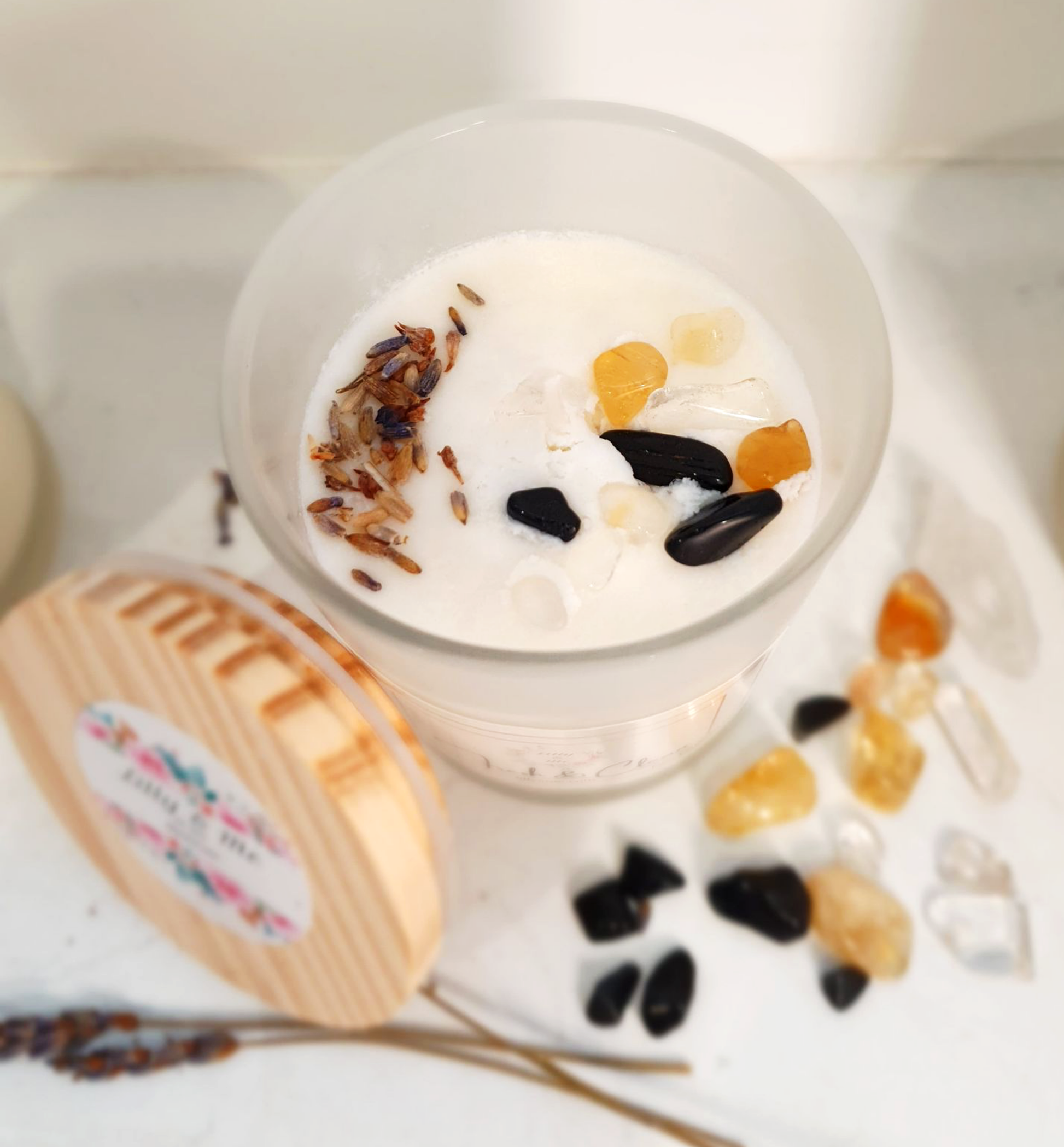 Fresh & Clean - For a beautifully fresh and clean smelling house, this is the candle for you. Lemon, Lavender, Tea Tree, Quartz, Citrine, Obsidian, Lavender flowers.