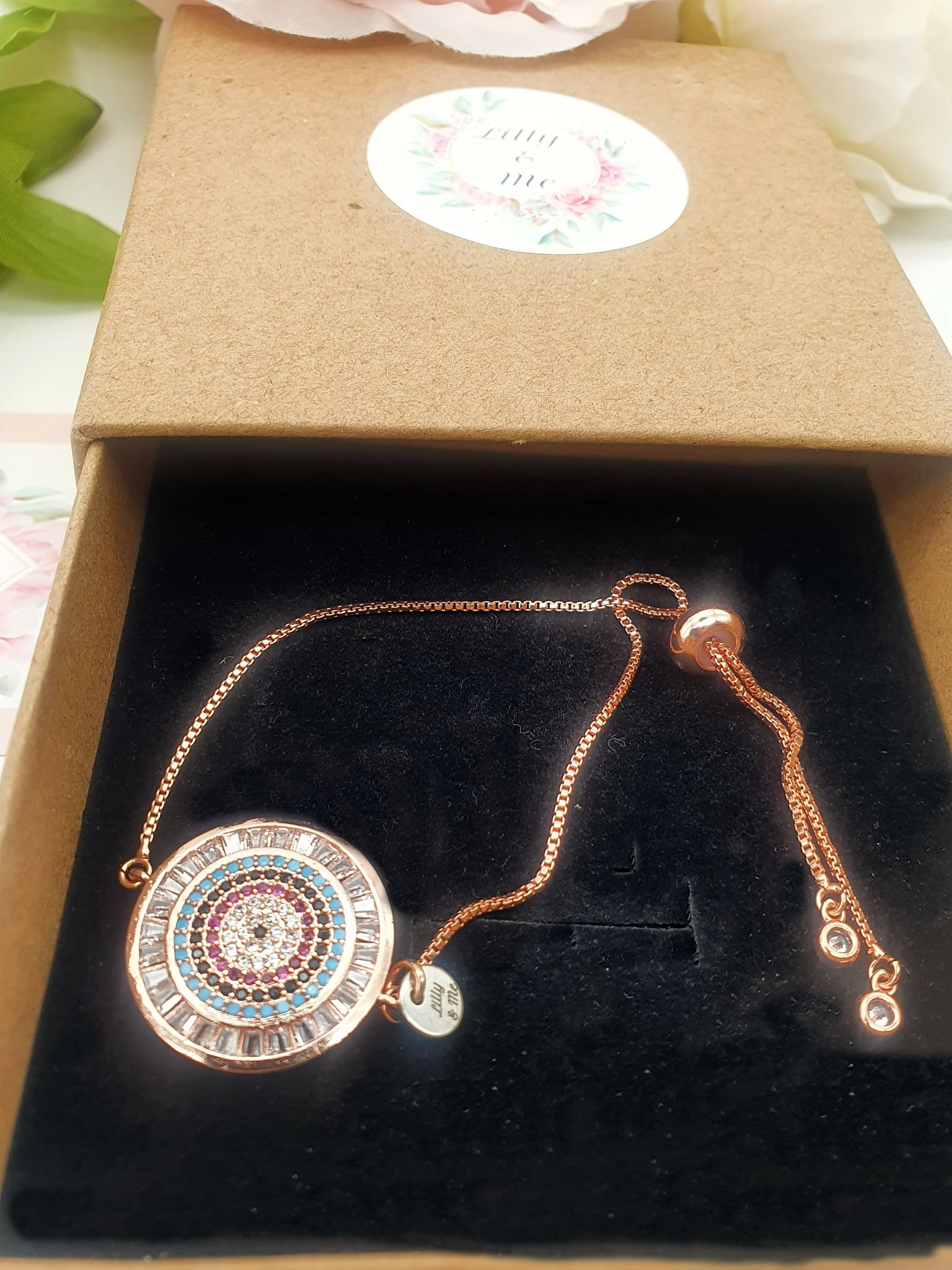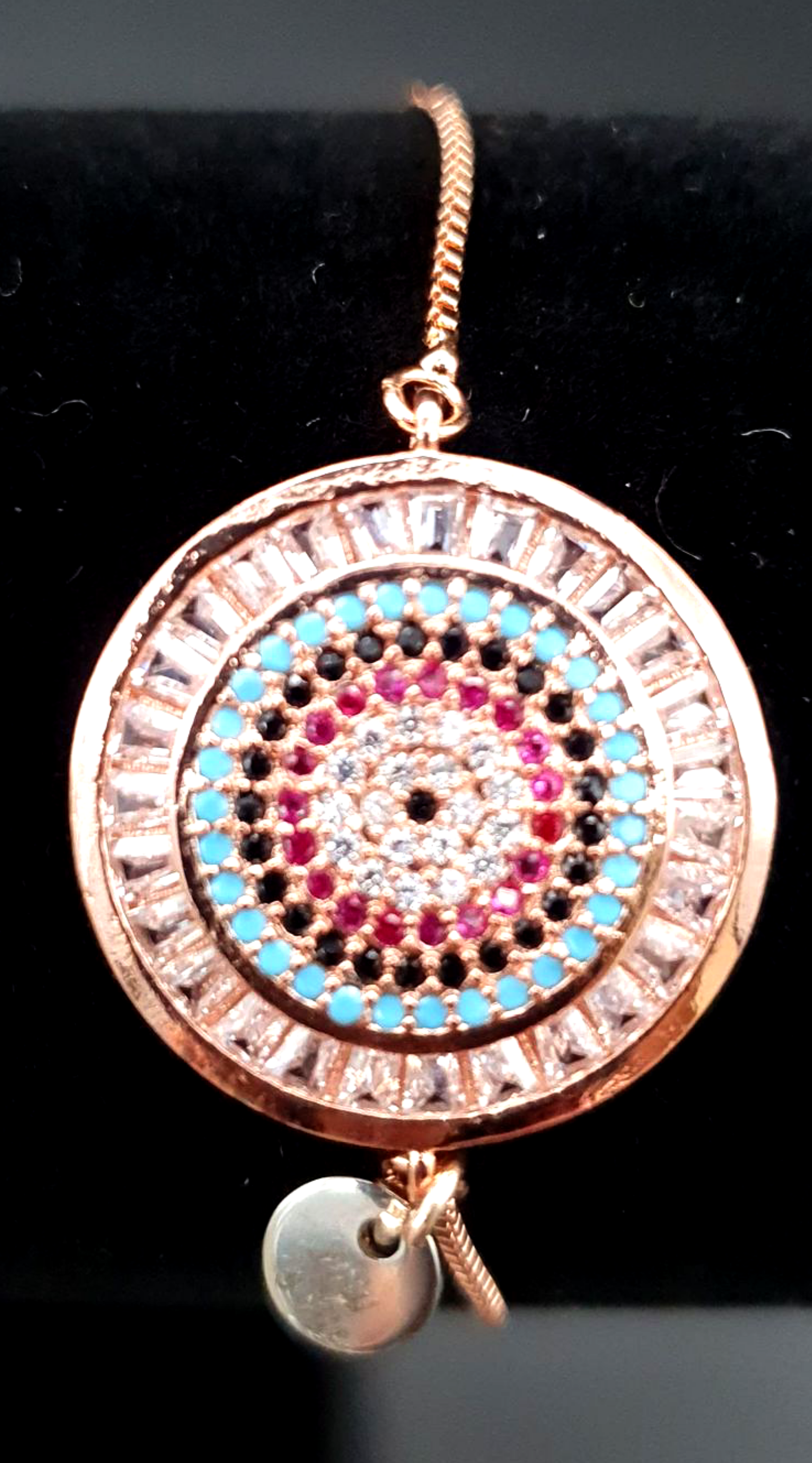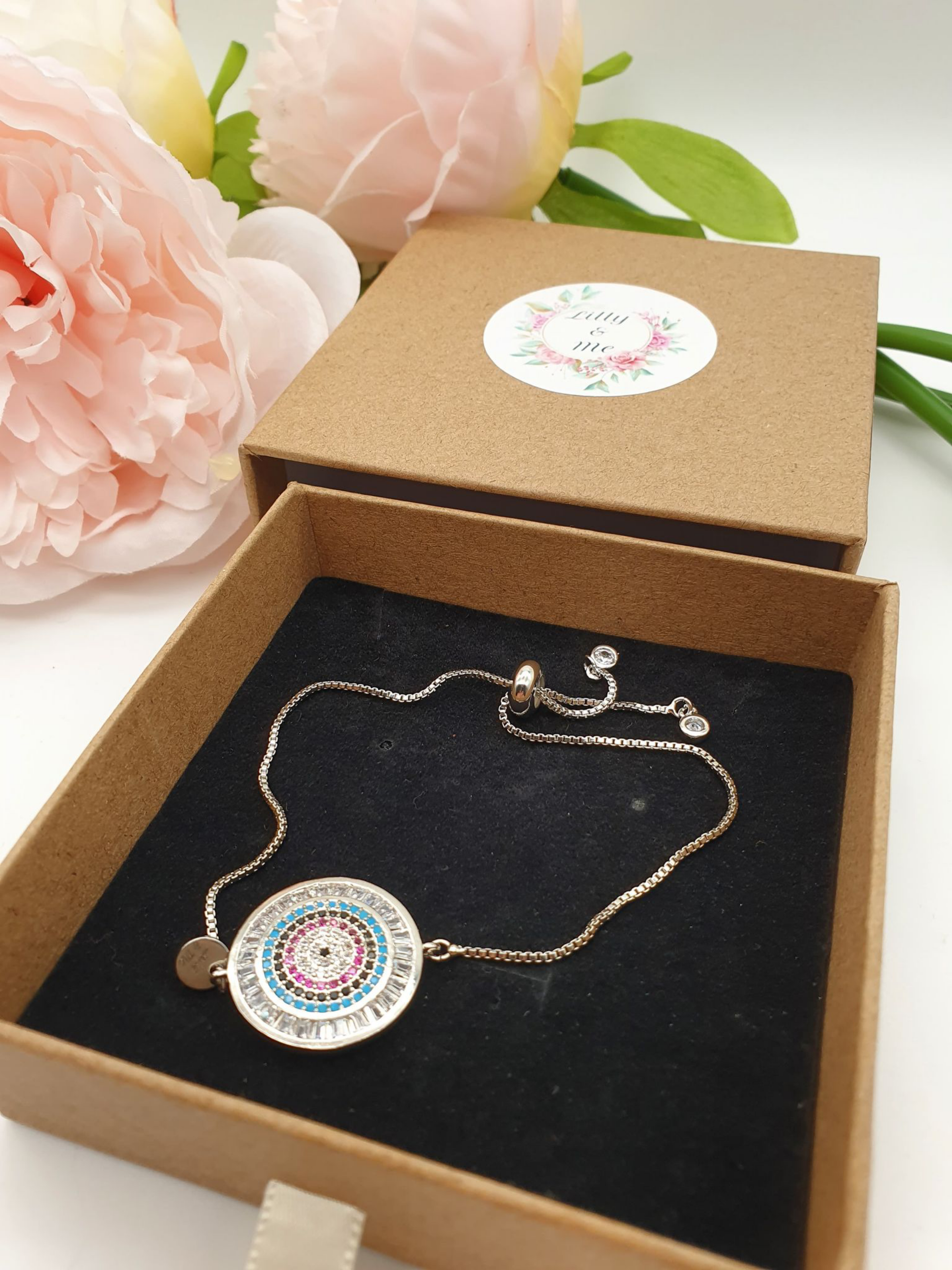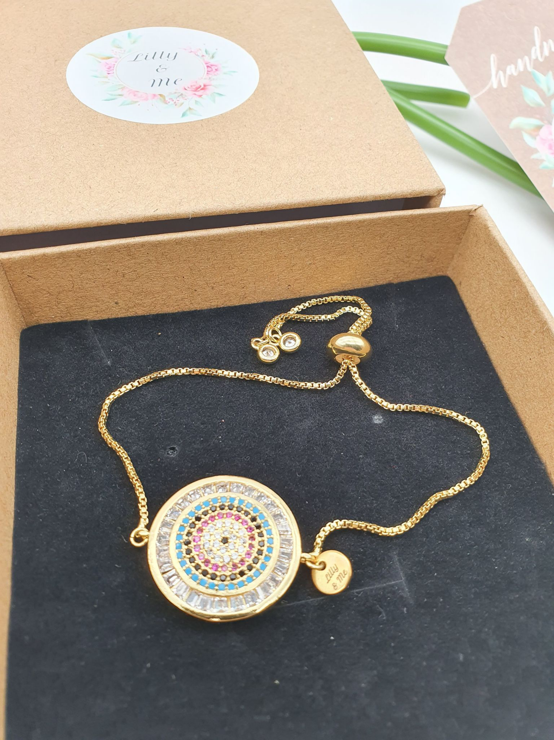 This delicate Greek Evil Eye Bracelet in Gold or Silver, with crystal inserts is a beautiful yet powerfully protective piece of jewelry for any wrist. The eye measures approx 2.3cm across.