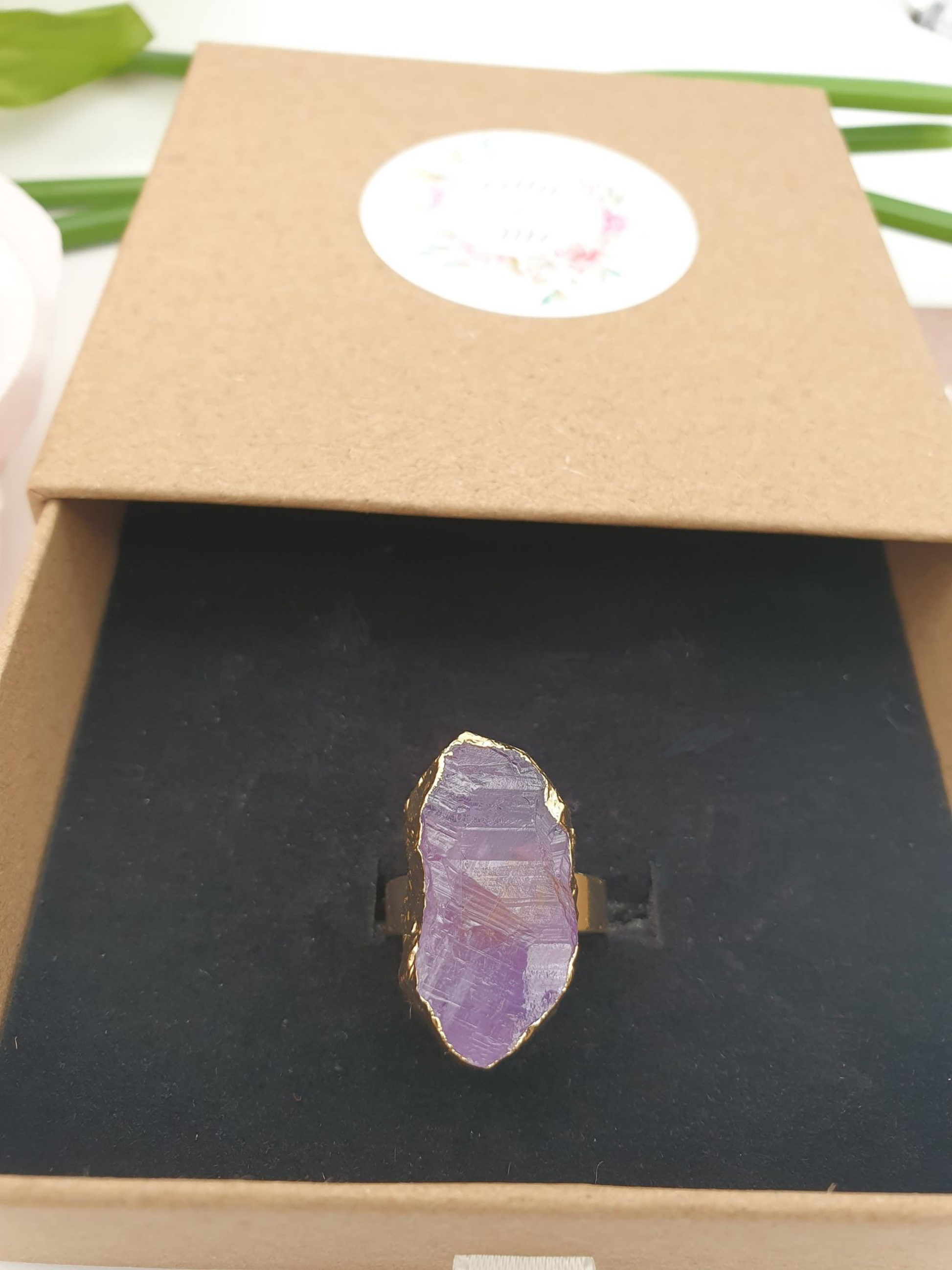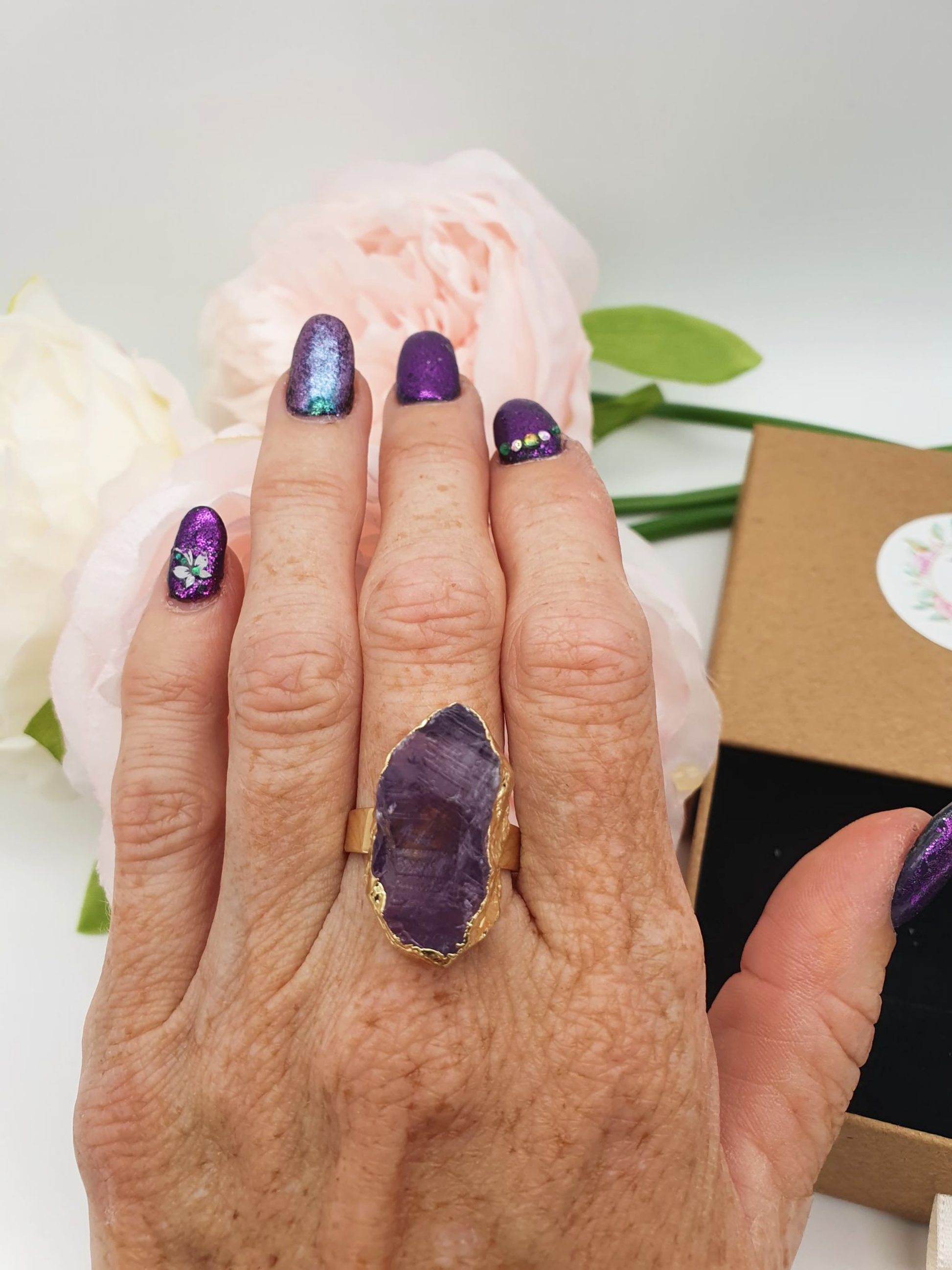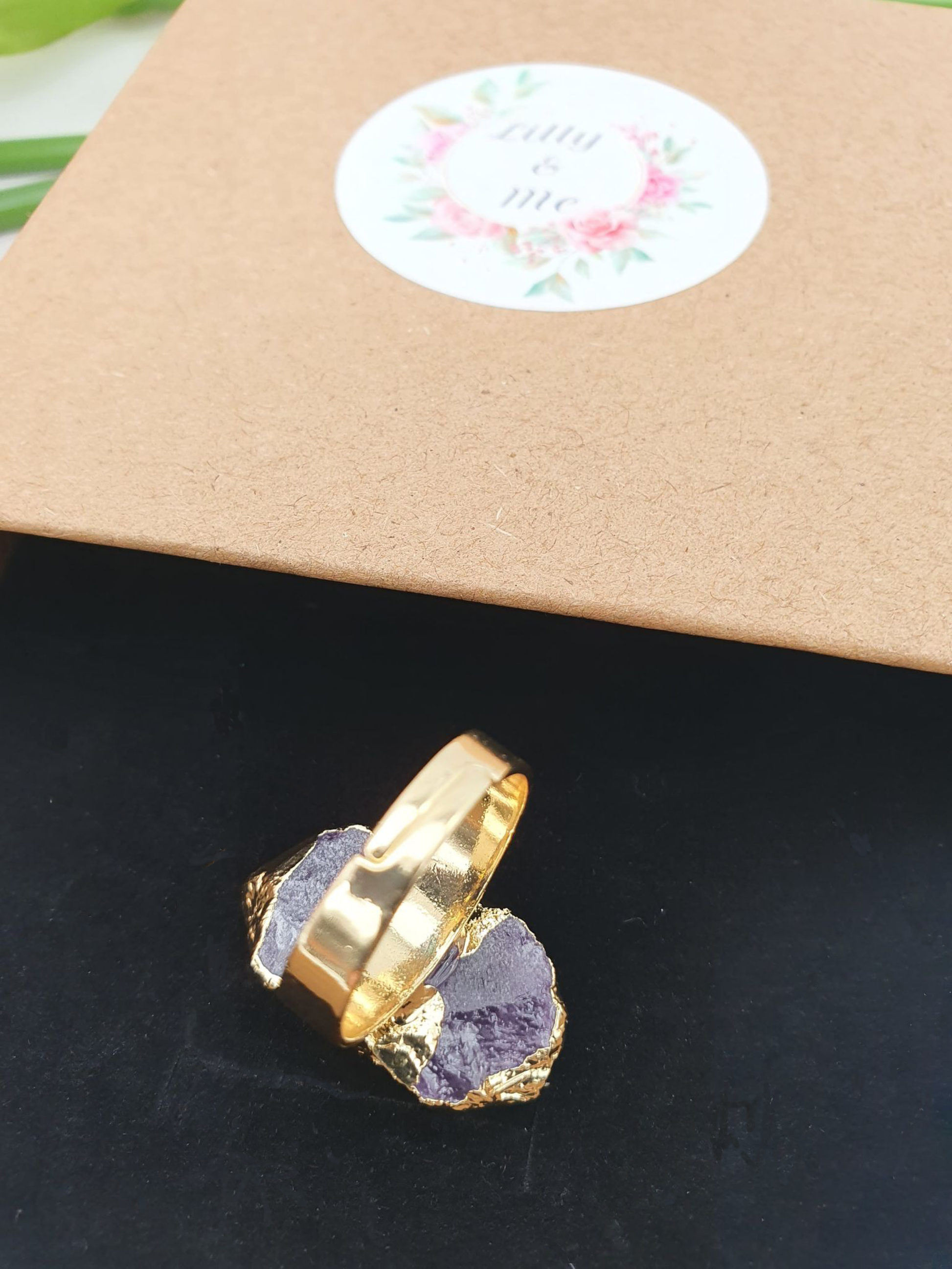 This beautiful statement ring is made with natural raw Amethyst and a 24ct Gold over zinc alloy adjustable ring.