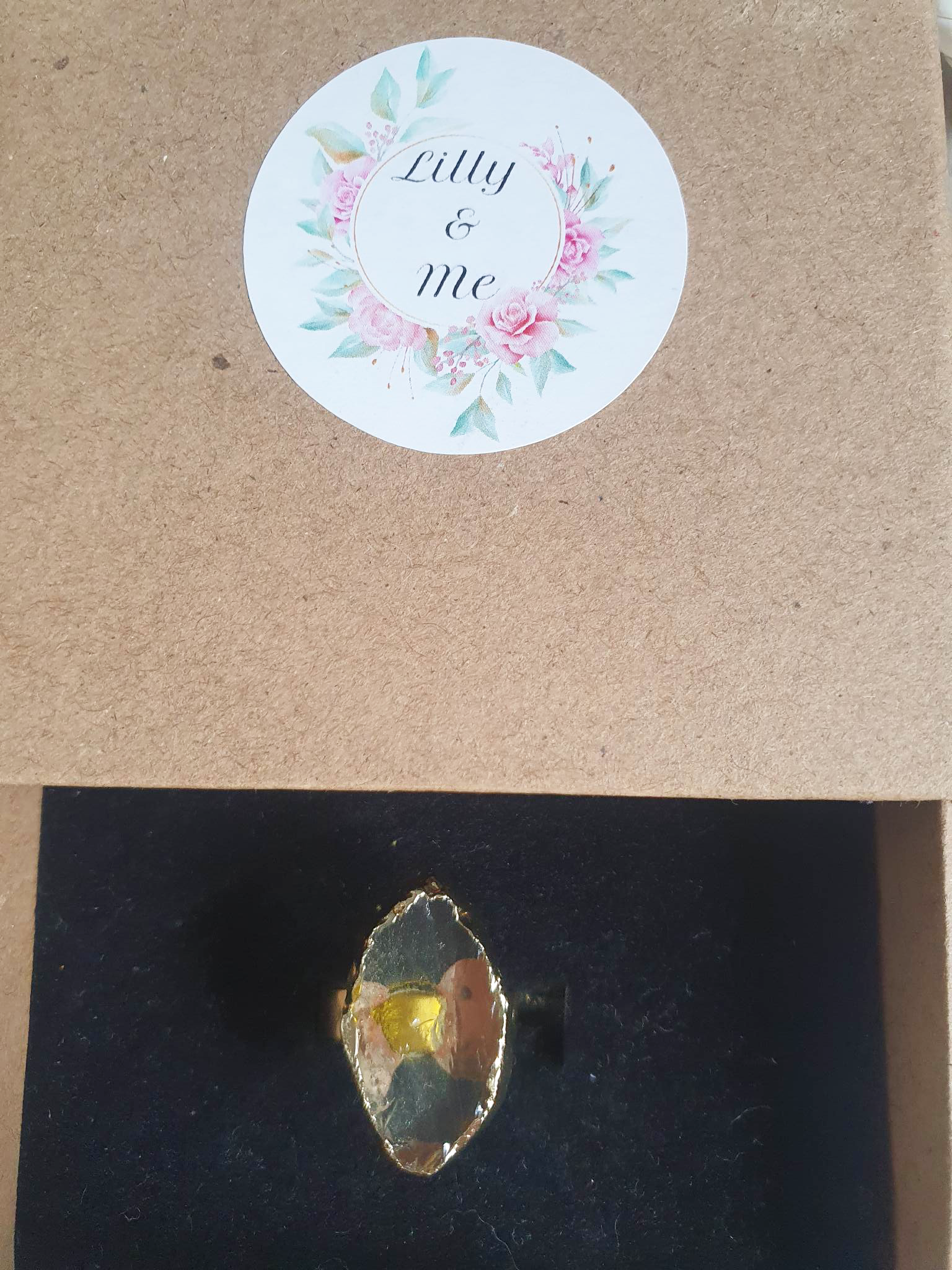 This beautiful statement ring is made with natural raw Citrine and a 24ct Gold over zinc alloy adjustable ring.