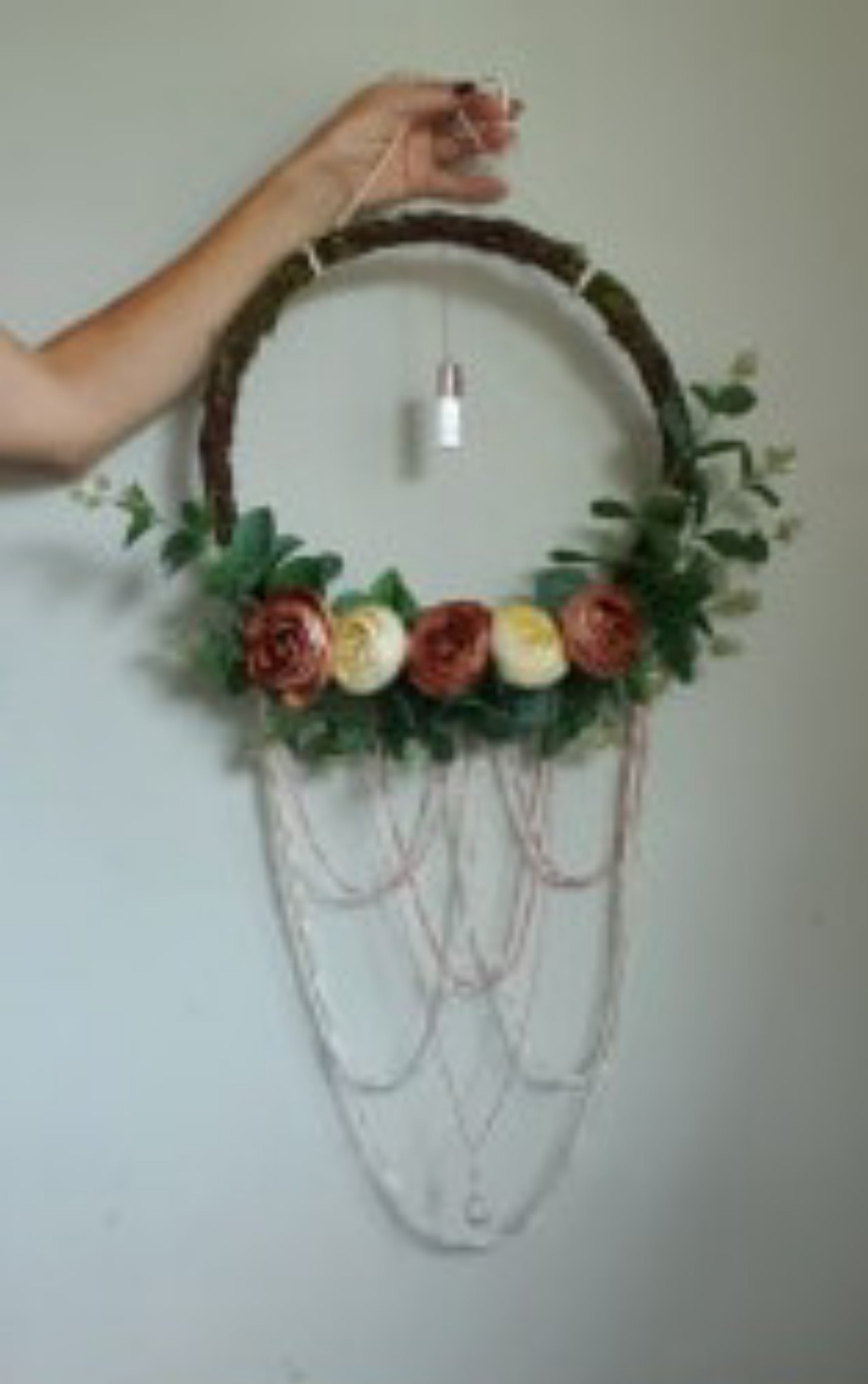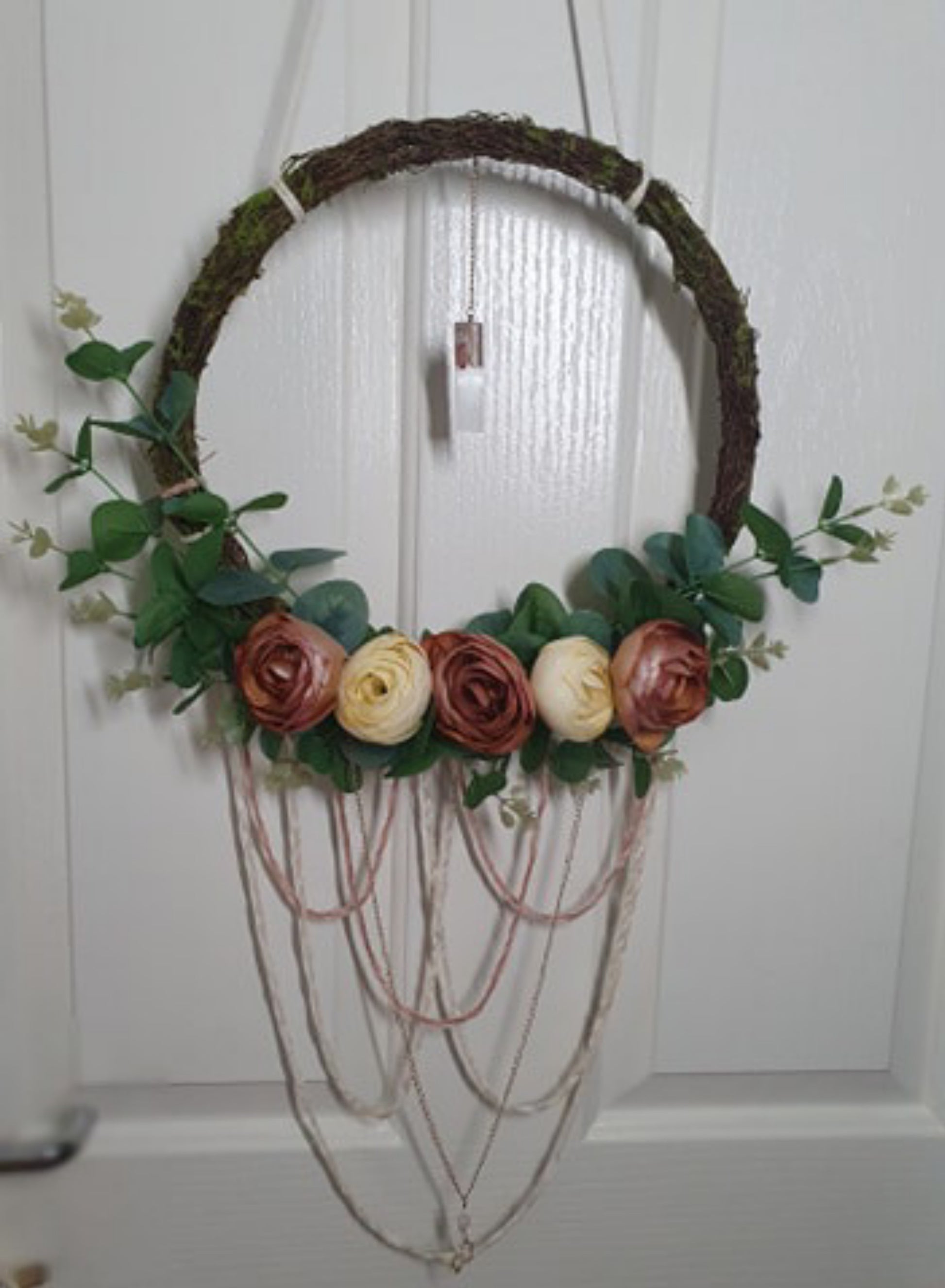 It has simulated roses in Rose and Cream, Eucalypt sprays, brush wreath as a base.