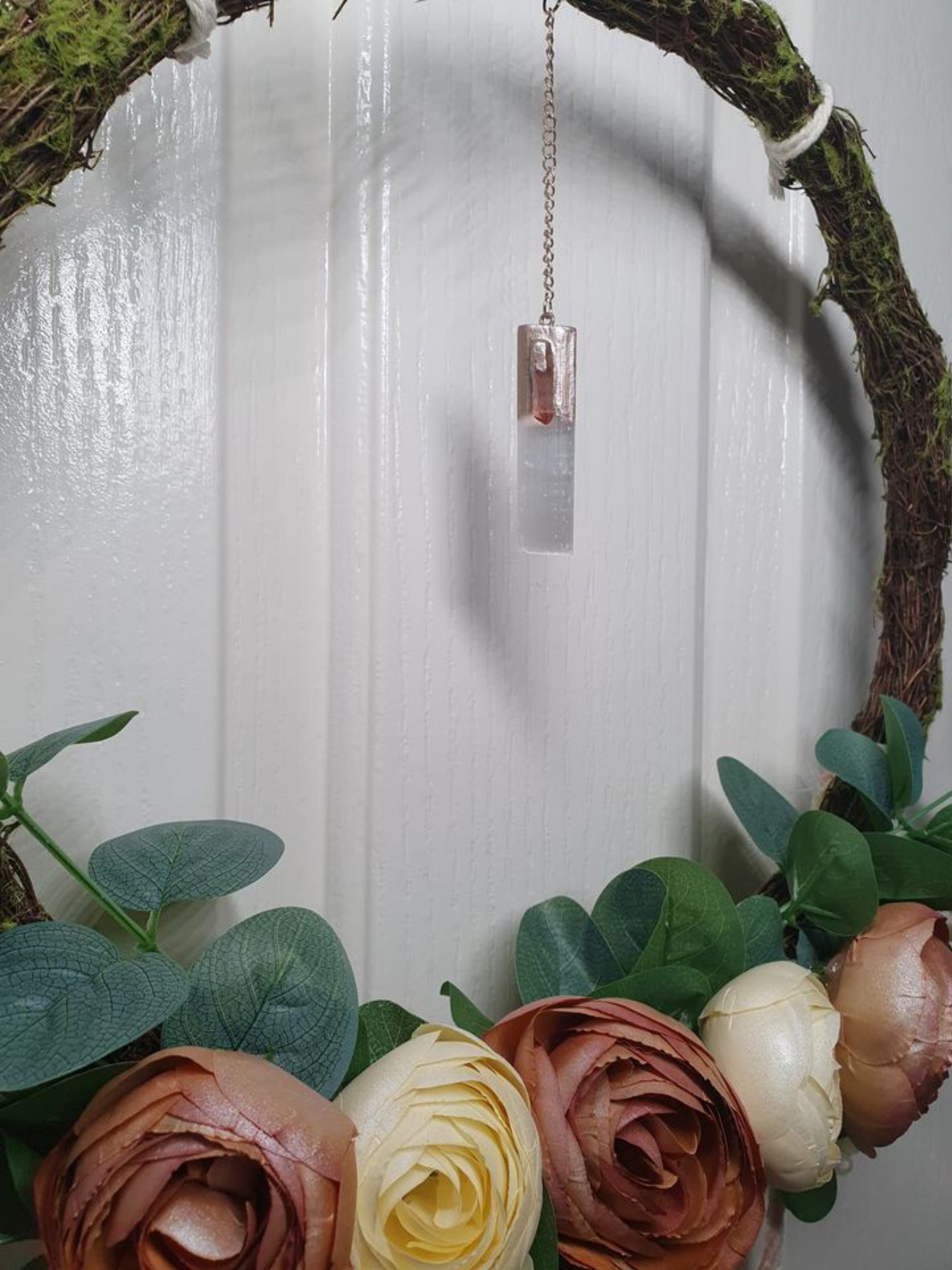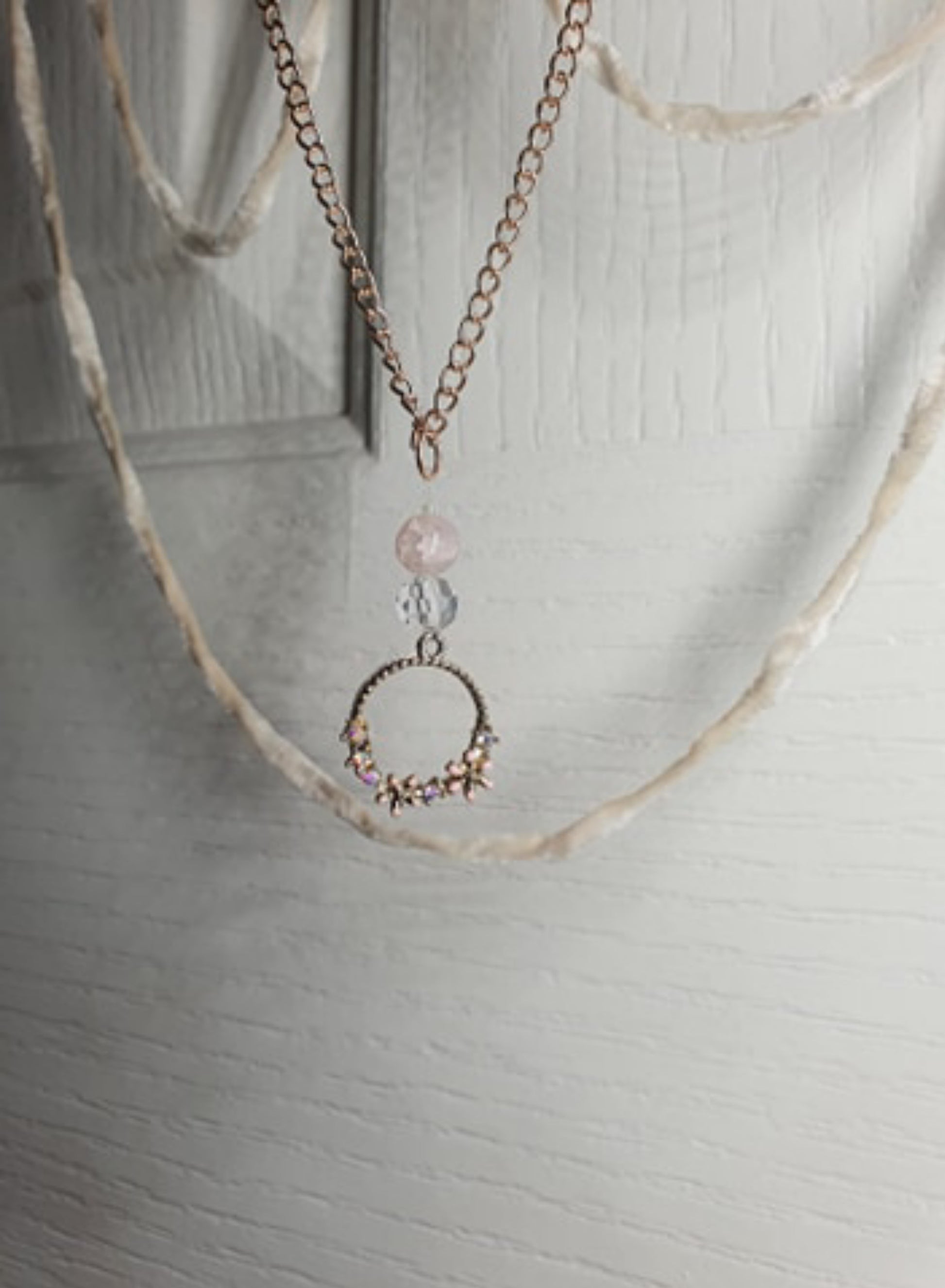 What makes it so amazing is the Genuine Selenite and Grossular Garnet hanging on a rose gold chain. The soft draping of chenille wool off the bottom completed with a rose old chain holding Rose Quartz, Crystal and pendant just finish it off in understated luxury.
