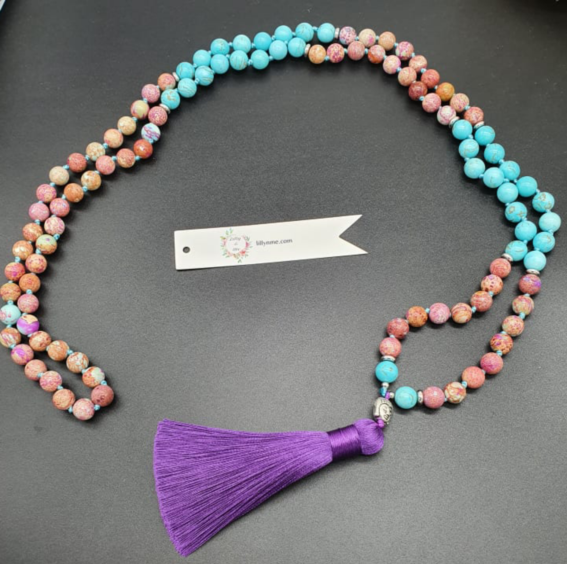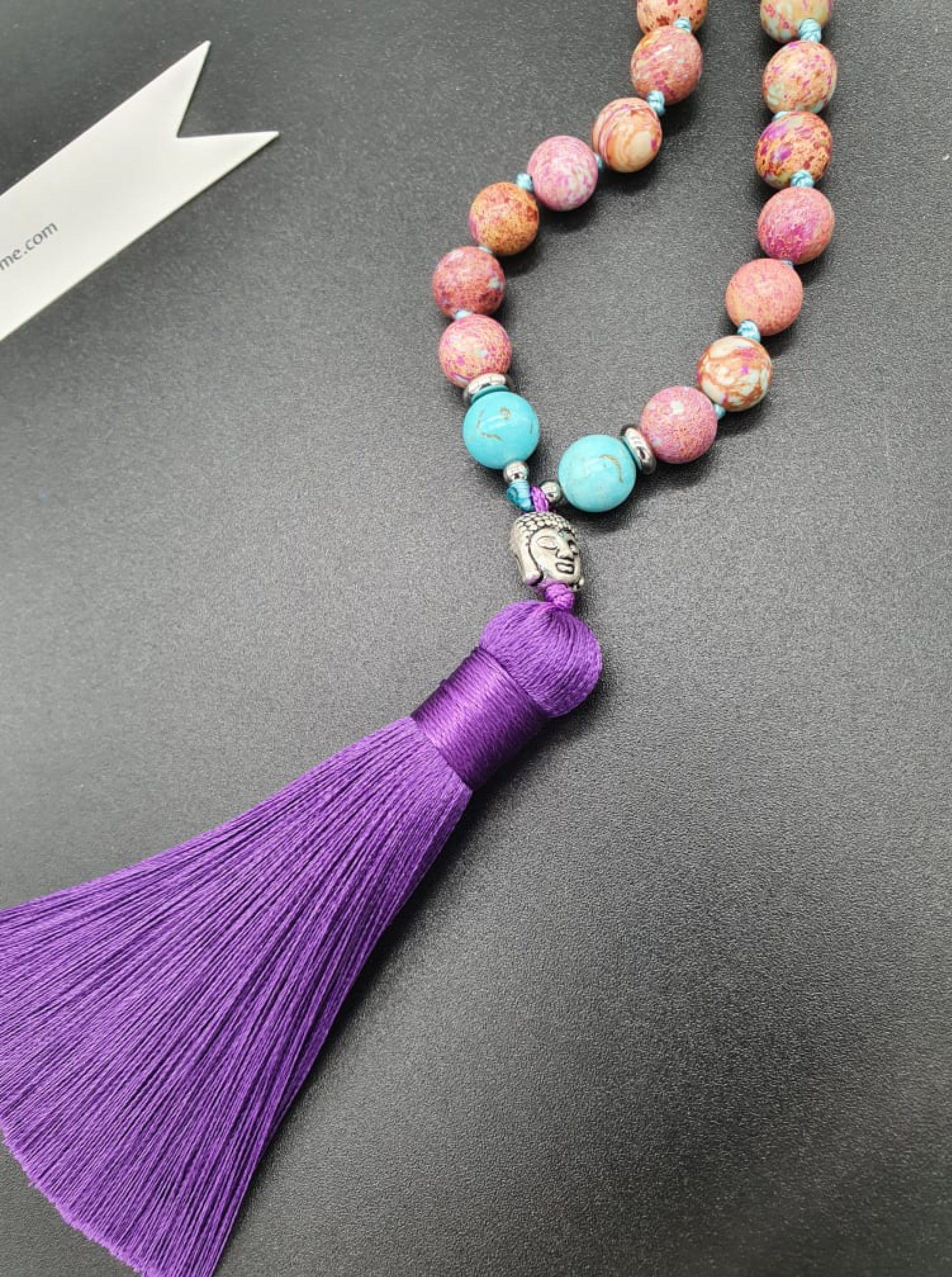 The mala measures an approx 62cm drop, including the tassel. The stones are the timeless Turquoise and the enchanting Violet Imperial Jasper.